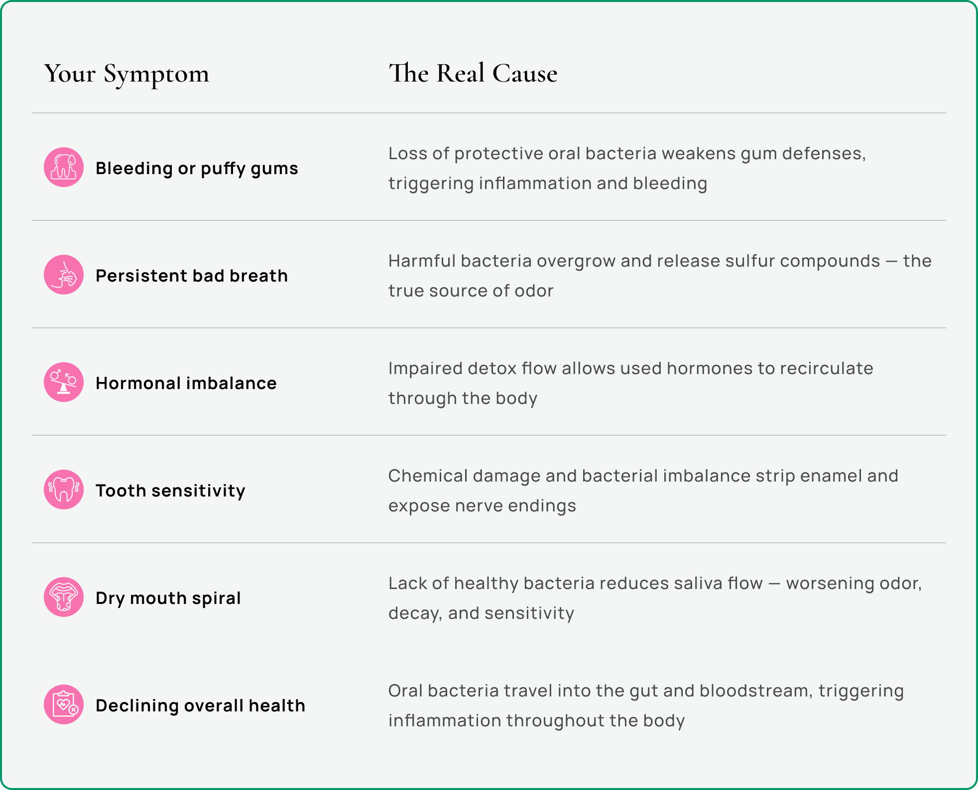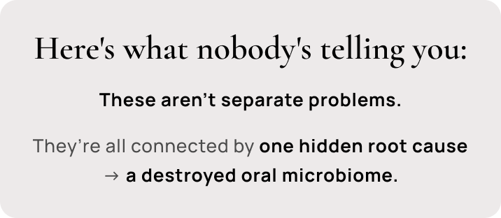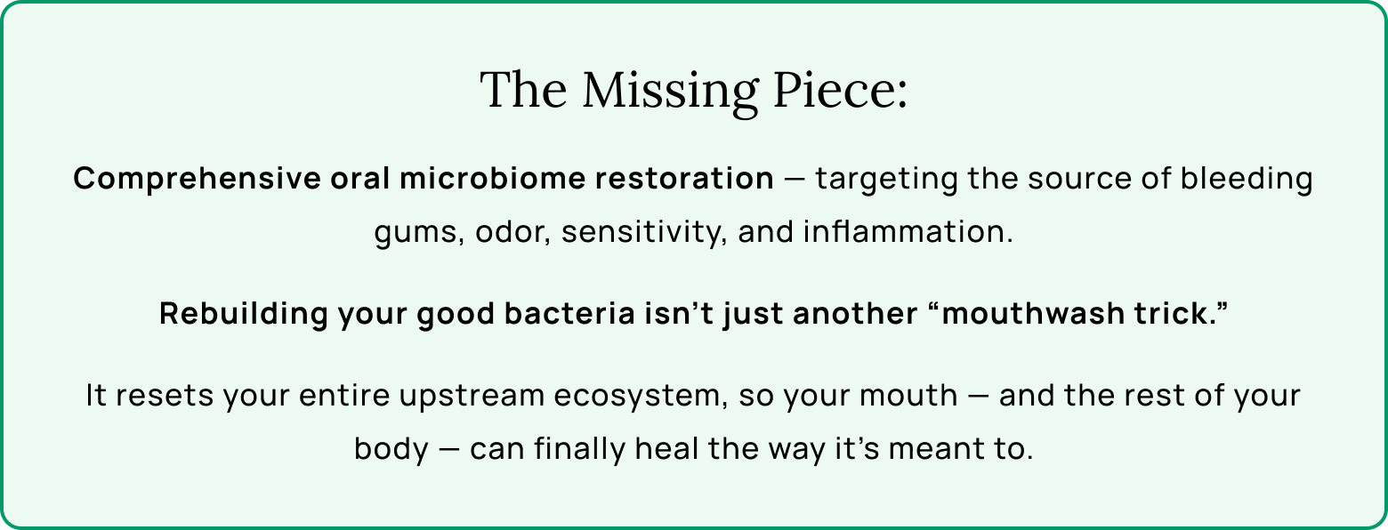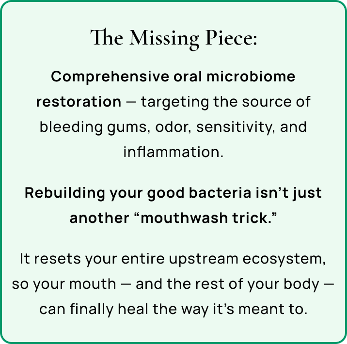 Rebuilding your oral microbiome resets the chain reaction behind bleeding gums, odor, sensitivity, and inflammation.It doesn’t just help your mouth — it supports your whole system.