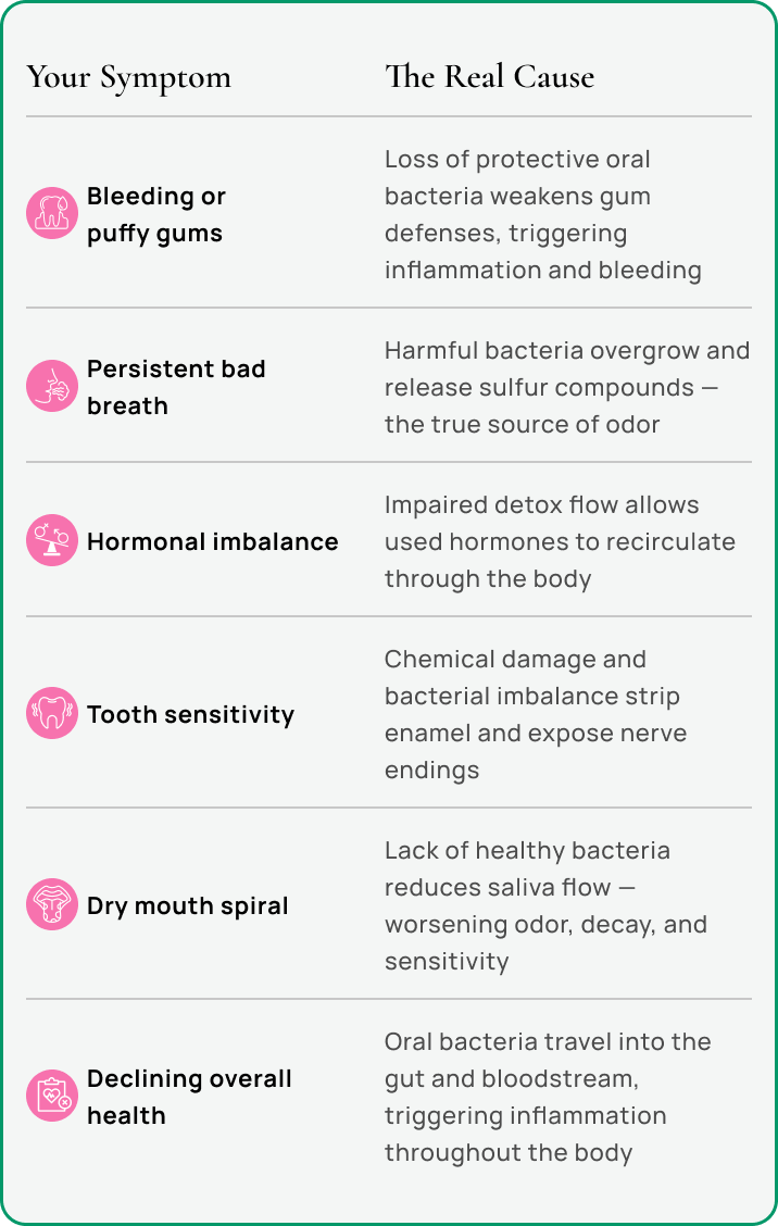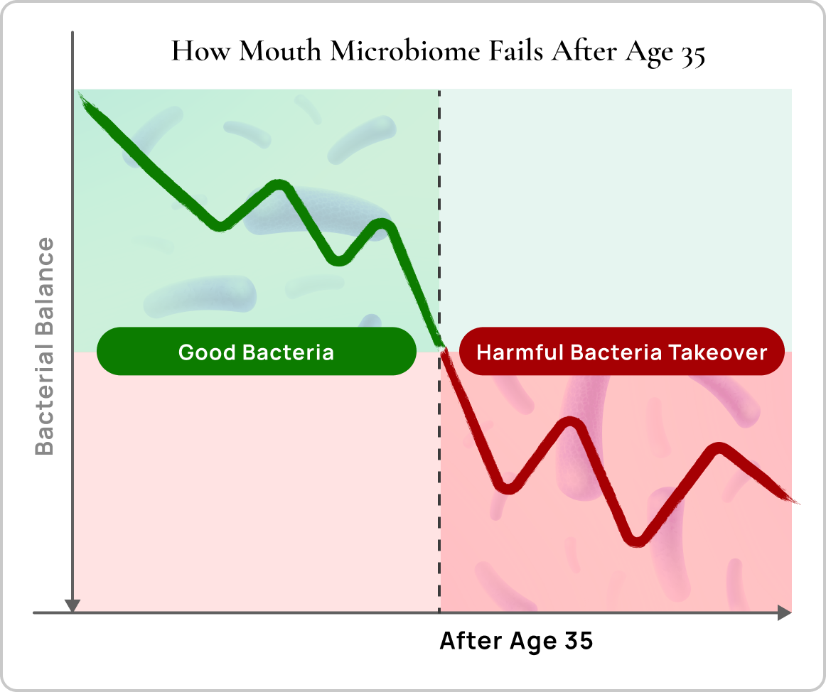 But over time, harsh dental chemicals, chronic stress, and bacterial overgrowth break down that shield. The good bacteria disappear — and the bad ones take over.