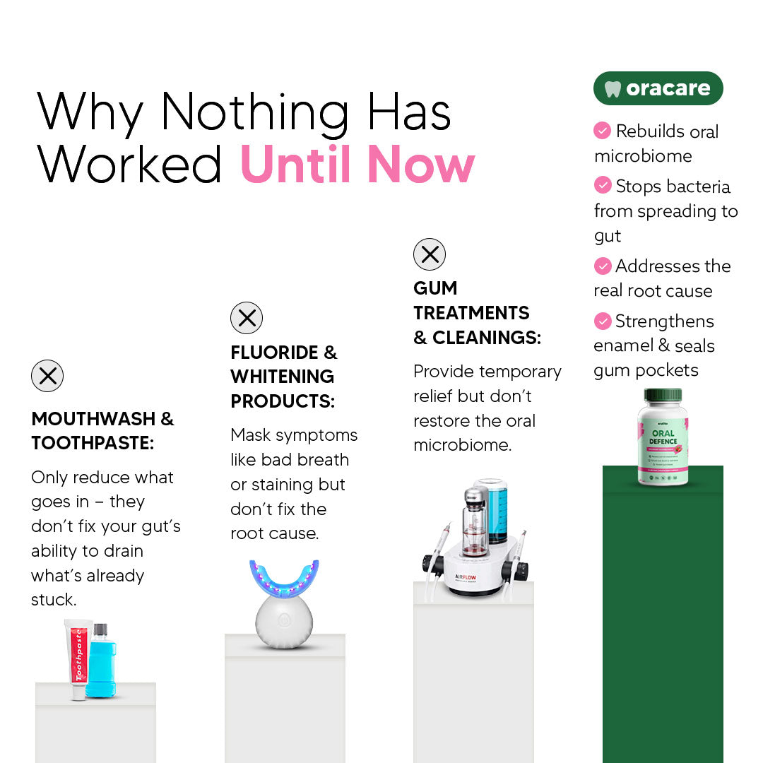 Oral Defence by Oralite targets the hidden root cause of bleeding gums, bad breath, sensitivity, and dry mouth by restoring balance to your oral microbiome. Instead of masking problems, it helps your mouth repair and protect itself naturally.